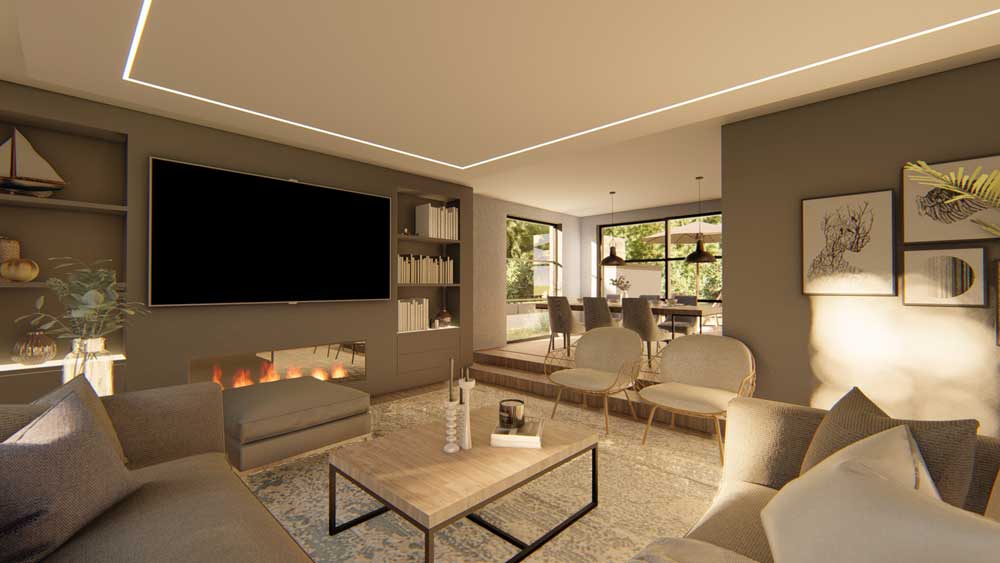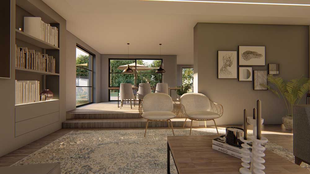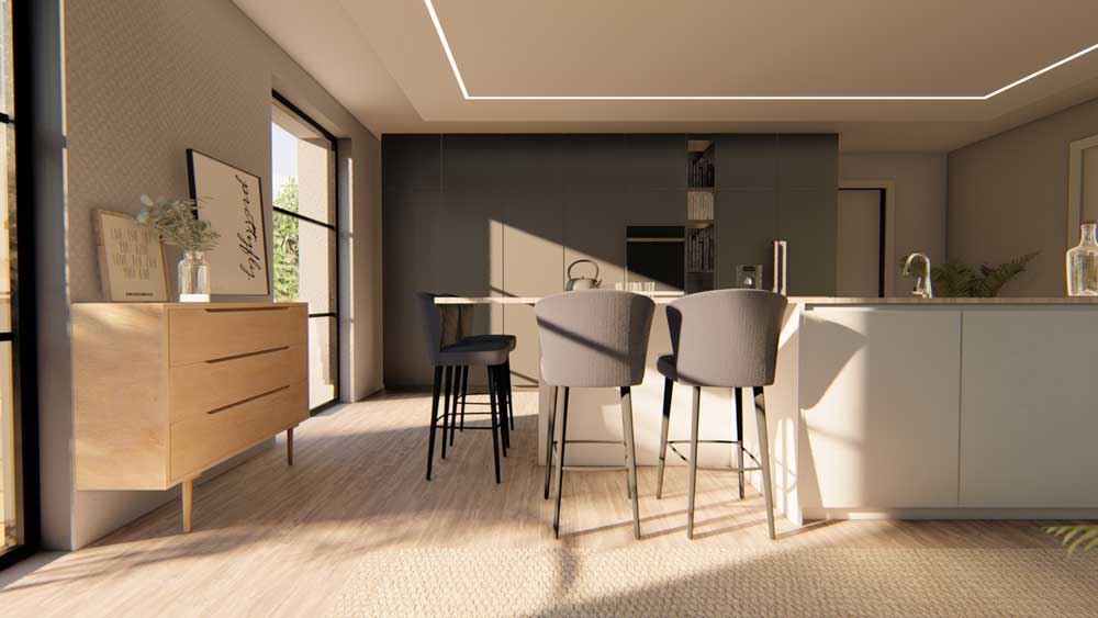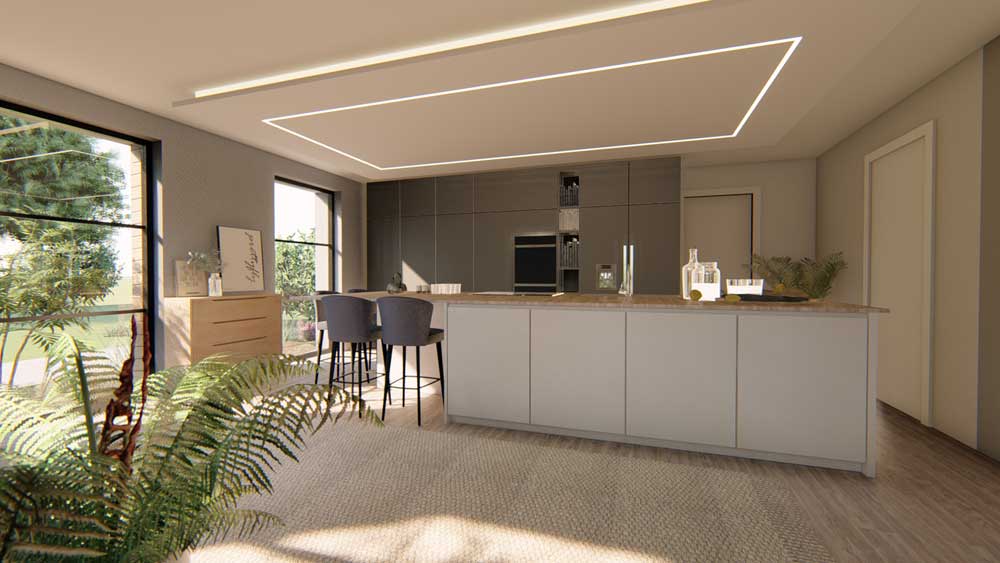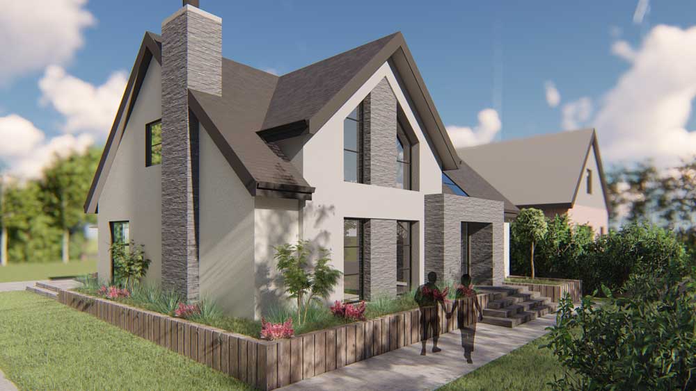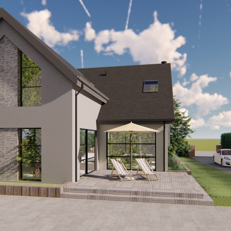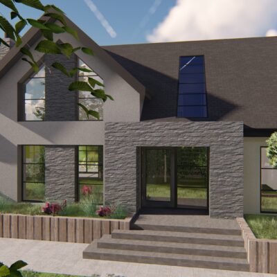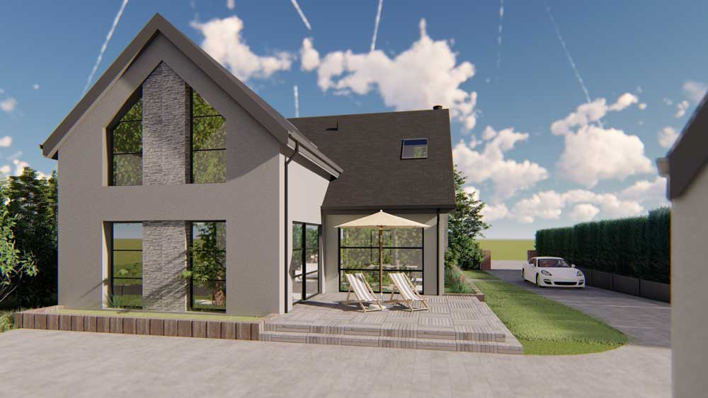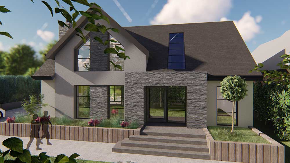 Carters have proposed to reconfigure the roof whilst maintaining the same overall height but changing the geometry of the roof introducing a front a rear gable dormer to allow two additional bedrooms within the roof space, we have then reconfigured the ground floor and proposed a new feature entrance and a new two-story rear extension. Providing additional bedrooms within the roof space and a modern open plan kitchen, dining, and living area to the ground floor.
