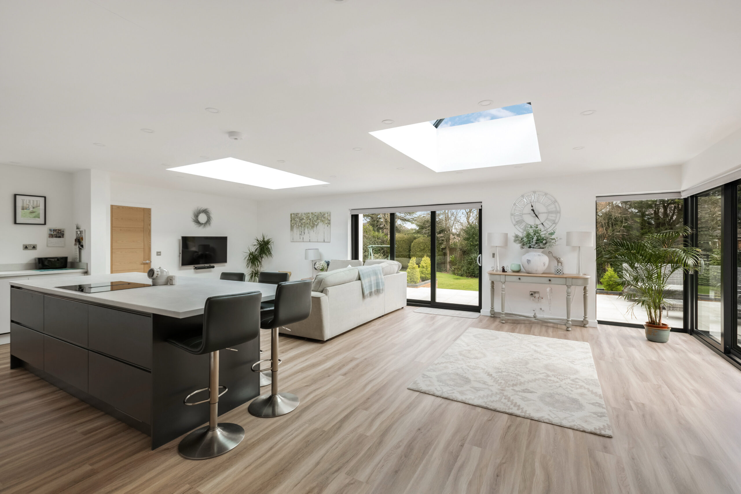 Single-Storey Rear Extension: We constructed a rear extension to create a spacious, open-plan kitchen, dining, and living area. This new zone now forms the hub of the home, designed for modern family living. Expansive sliding glass doors frame views of the landscaped garden and allow natural light to flood the space, enhancing the connection between indoors and out.