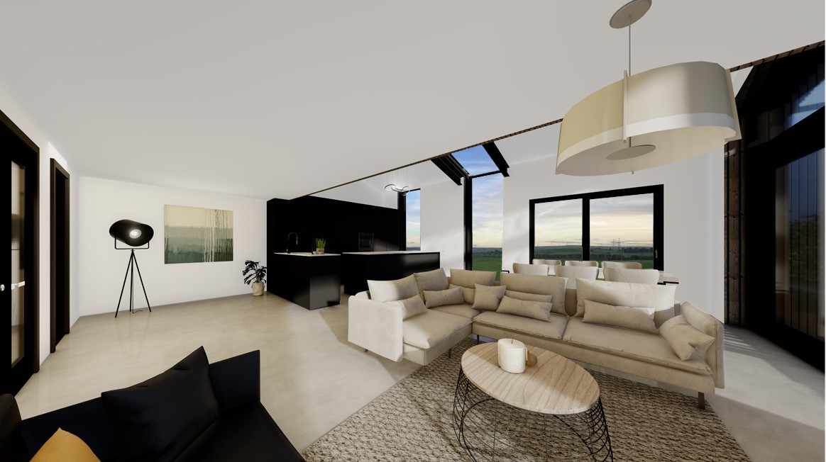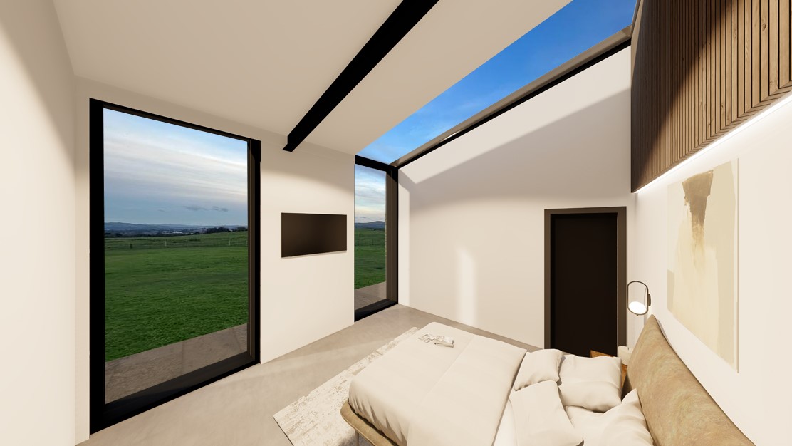 The agricultural building has been divided in three dwellings. The first set of visual below show off the first dwelling proposed with floor to ceiling windows maximise the views around the site which benefits 360 degree views for miles and hill top views in the horizon. This has been a key design influence for the class Q conversion. The external appearance has used the existing shell and similar material as the existing with new window and door openings proposed. The roof has received a new zinc roof covering and feature floor to apex windows maximising on those views form every vantage point in the house.